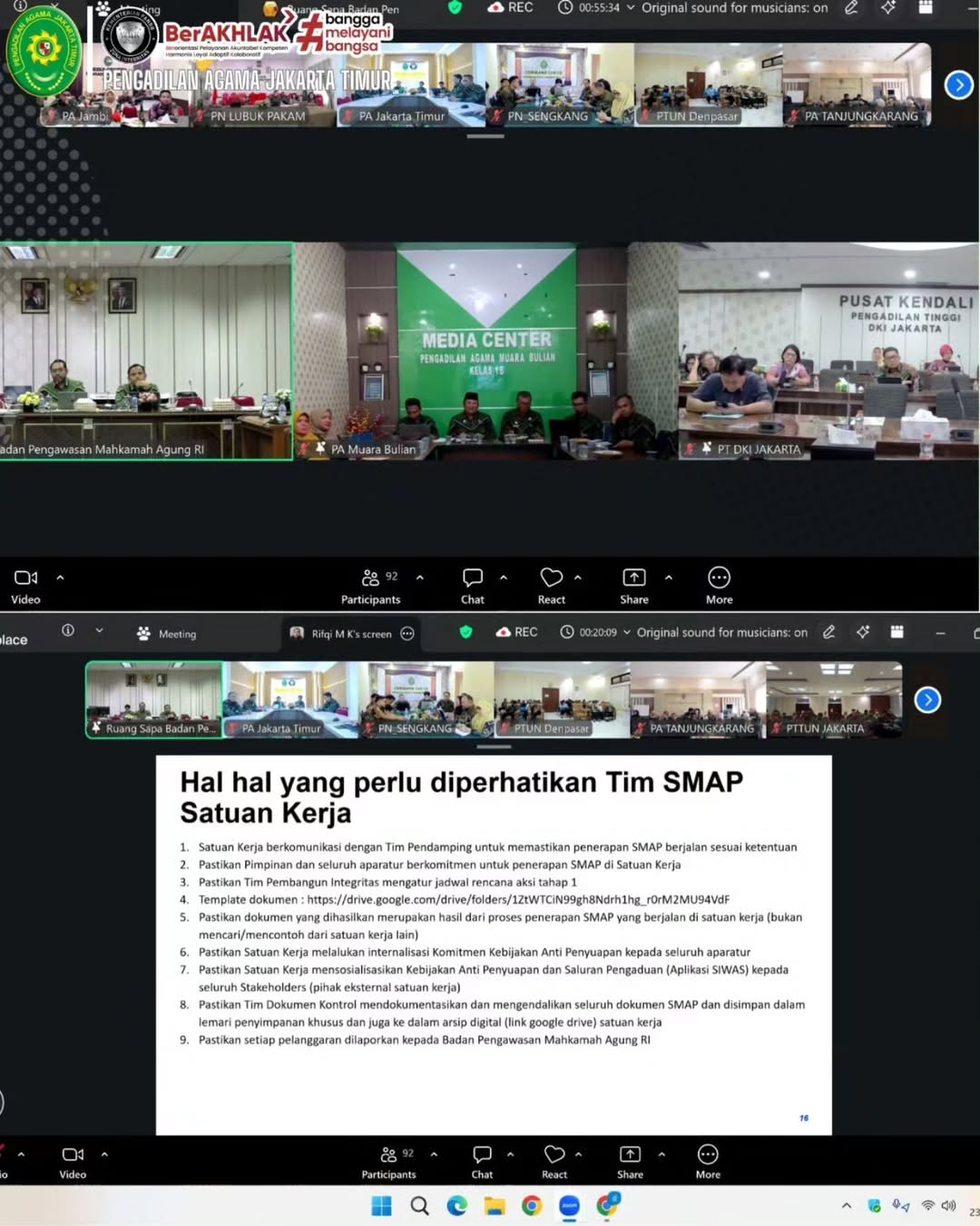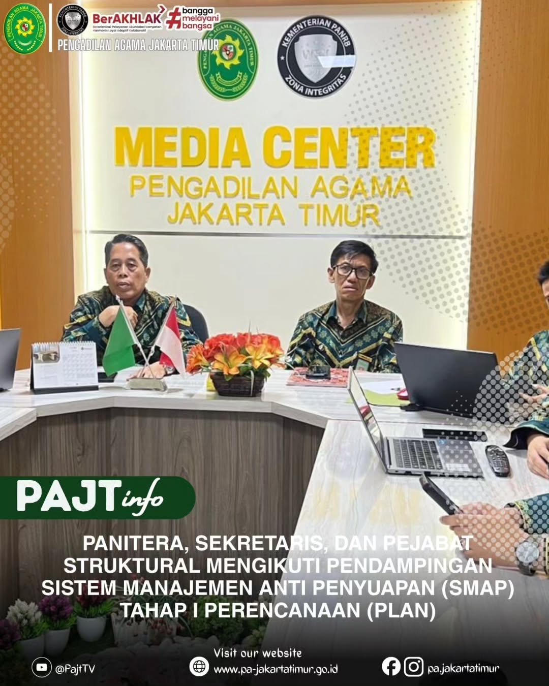 23 April 2026 - Bertempat di Media Center Pengadilan Agama Jakarta Timur, Panitera, Sekretaris, serta para pejabat struktural mengikuti kegiatan Pendampingan Sistem Manajemen Anti Penyuapan (SMAP) Tahap I dengan fokus pada tahap Perencanaan (Plan) secara daring.