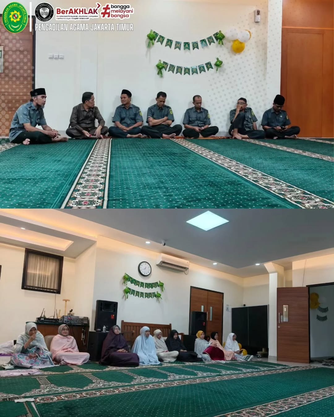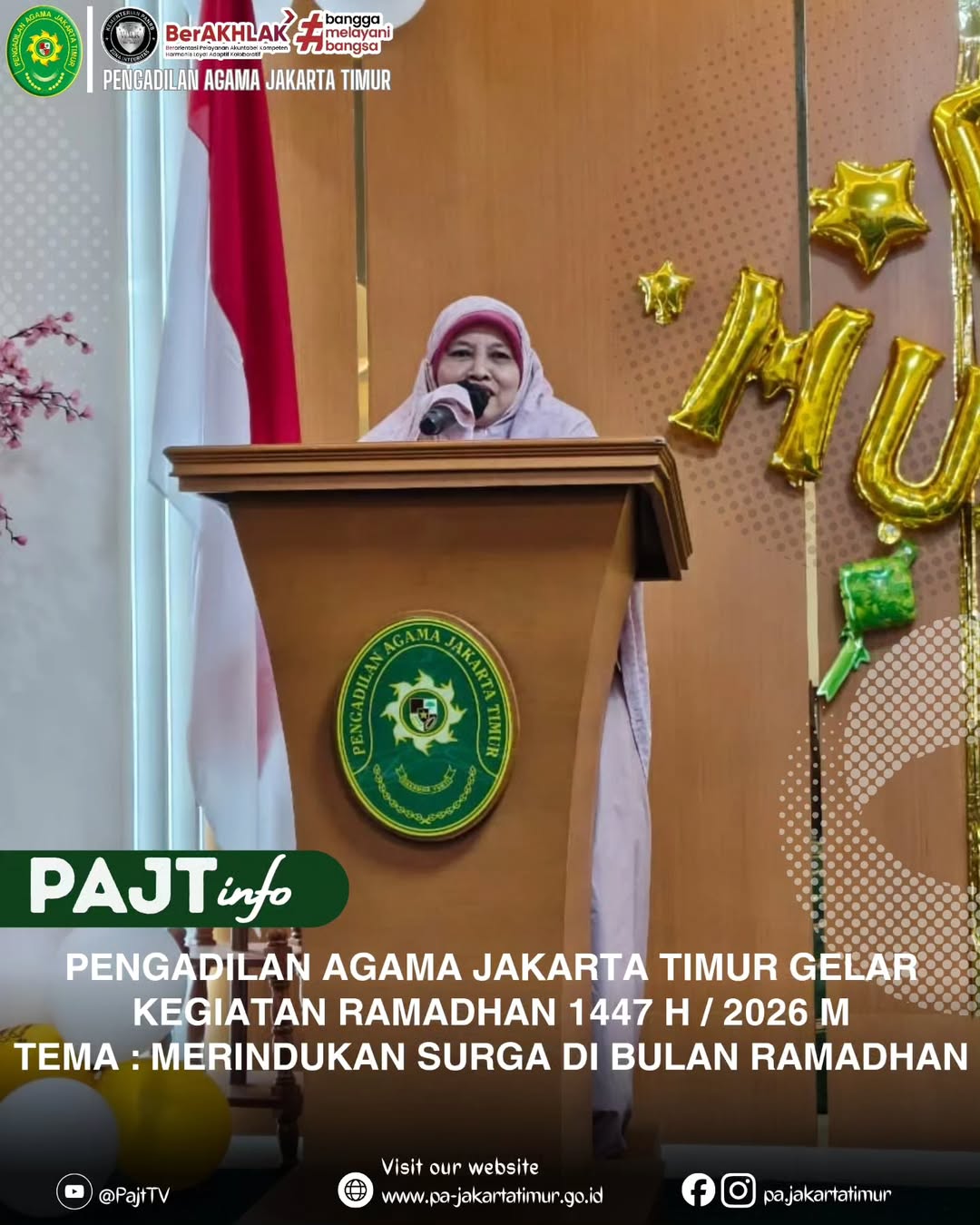 10 Maret 2026 - Pengadilan Agama Jakarta Timur menyelenggarakan kegiatan keagamaan selama bulan suci Ramadhan yang dilaksanakan di Aula Pengadilan Agama Jakarta Timur. Kegiatan ini diisi dengan pelaksanaan salat berjamaah dan kultum yang rutin dilaksanakan sebagai upaya meningkatkan keimanan dan ketakwaan seluruh aparatur peradilan.