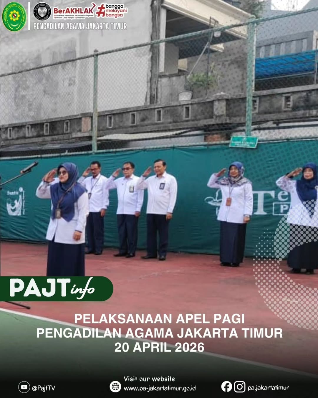 20 April 2026 - Bertempat di halaman kantor Pengadilan Agama Jakarta Timur telah dilaksanakan kegiatan rutin apel pagi. Adapun yang bertindak sebagai pembina apel yaitu Ibu Dra. Mulathifah M.H. (Hakim Pengadilan Agama Jakarta Timur). Kegiatan apel pagi rutin ini diikuti oleh Para Hakim, Pejabat Fungsional dan seluruh staf Pengadilan Agama Jakarta Timur.
